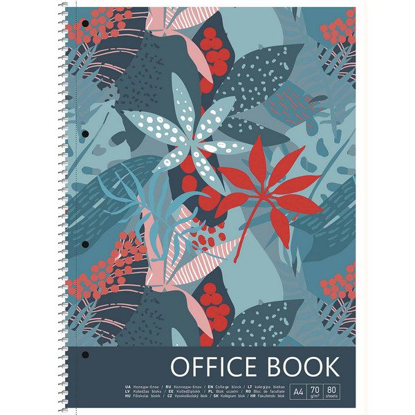 Коледж-блок формат А4, Кріплення: спіраль Кількість аркушів: 80, кремовий колір Обкладинка: м'яка картонна щільність 210гр Дизайн: асорті 2 види Внутрішній блок: лінія Папір білий, 70гр щільність Мікроперфорація, отвори для папки-реєстратора
