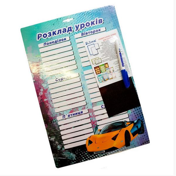 У разі, коли дитині необхідна постійне і ефективне нагадування про те, які уроки він має відвідати в школі і до них підготуватися, зручно використовувати засіб, відомий як дошка для розкладу уроків. Формат такого шкільного інструменту може змінюватися від А4 до А3 і навіть до А2, однак найбільш уживаний в побуті все-таки формат А3, що дозволяє комфортно розмістити на робочій поверхні всю необхідну учневі інформацію. Товщина картону 2 мм. Укомлектована серветкою для стирання написів та сухостираємим WHITE BOARD маркером.