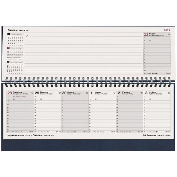 Класичний настільний планінг - це зручний і незамінний інструмент для планування на робочому місці. Продуманий внутрішній блок, обробка обкладинки, європейський папір щільністю 80 г / м2 з сірим друком, сторінки для загального планування на рік - кожна деталь тижневика уособлює справжню німецьку якість. Датований планинг допоможе максимально зручно спланувати розпорядок дня, тижня і місяця.Неймовірно м'яка і тактильно приємна обкладинка Torino синього кольору підкорює з першого дотику. Інформація всередині представлена на трьох мовах: українською, російською та англійською. Формат - тиждень на розвороті і область для нотаток. • На розвороті: весь тиждень і область для нотаток. • Організатор з 7 до 20. • Сторінки для загального плану