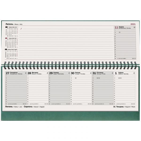 Класичний настільний планінг - це зручний і незамінний інструмент для планування на робочому місці. Продуманий внутрішній блок, обробка обкладинки, європейський папір щільністю 80 г / м2 з сірим друком, сторінки для загального планування на рік - кожна деталь тижневика уособлює справжню німецьку якість. Датований планинг допоможе максимально зручно спланувати розпорядок дня, тижня і місяця.Неймовірно м'яка і тактильно приємна обкладинка Torino зеленого кольору підкорює з першого дотику. Інформація всередині представлена на трьох мовах: українською, російською та англійською. Формат - тиждень на розвороті і область для нотаток. • На розвороті: весь тиждень і область для нотаток. • Організатор з 7 до 20. • Сторінки для загального плану