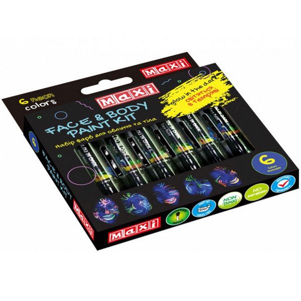Фарби для обличчя та тіла у формі олівця з механізмом викручування грифеля. 6 яскравих неонових кольорів, що світяться у темряві, оптимально підібрані для створення будь-якого образу на вечірці та у рольових іграх. Для того, щоб малюнок сяяв в темряві, частинки фарби мають зарядитися світлом. Для прискорення ефекту сяяння в темряві на несенений малюнок потрібно посвітити, наприклад, ліхтариком, близько 10 секунд.