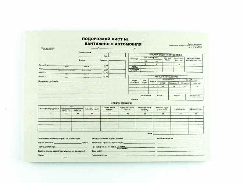 Бланк путевой лист грузового авто А-4 газ. 1+1 100л. кл. без номера Укр