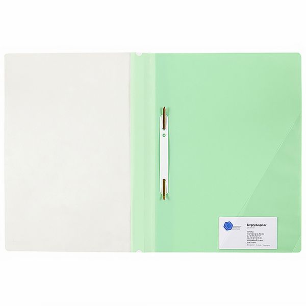 Папка-скоросшиватель формата А4 изготовлена из полипропилена, имеет прозрачный верхний лист. На лицевой стороне расположен карман с пластиковой полосой белого цвета, на которой можно указать содержание.