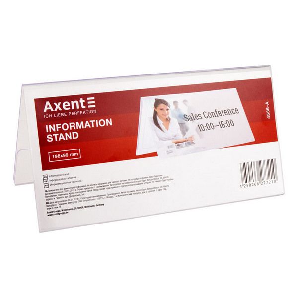 Именные таблички широко используются для организации рекламно-информационной поддержки. Именные таблички Axent – идеальный помощник во время проведений конференций, семинаров, презентаций, круглых столов. Также, применяются в ресторанах и кафе для демонстрации специальных меню, «горячих предложений»; в отелях и офисах – для обозначения столика рецепции и администратора. Полиграфические вкладыши легко меняются, а прозрачный полистирол, из которого изготовлены таблички Axent, не искажает цветопередачу и четкость изображений. Для различных целей есть различные размеры табличек, а также, есть одно- и двухсторонние таблички.