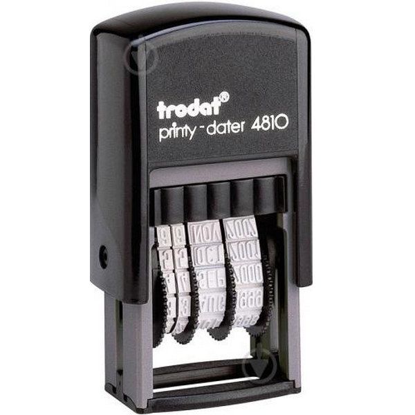 Датер пластиковый Trodat Printy 4810 (bank). Высота шрифта 3,8 мм. Месяца и годы прописаны числами. Применяется в тех ситуациях, когда нужно многократно проставить даты на документах. Часто используется в банковских учреждениях, курьерскими и почтовыми службами. Комплектуется штемпельной подушкой Trodat 6/4910 синего цвета. Сменная подушка бывает синего, фиолетового, черного, красного, зеленого цветов и неокрашенная.