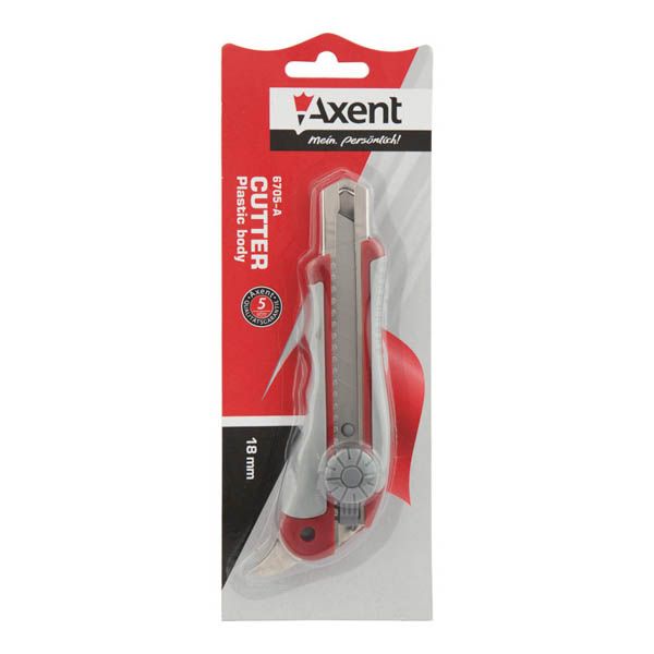 Нож канцелярский Axent 6705-A изготовлен из прочного пластика. Металлические направляющие для лезвий. Фиксация лезвия Twist- Lock (колесиком). Есть допольнительный нож для разрезания коробок Блистерная упаковка.