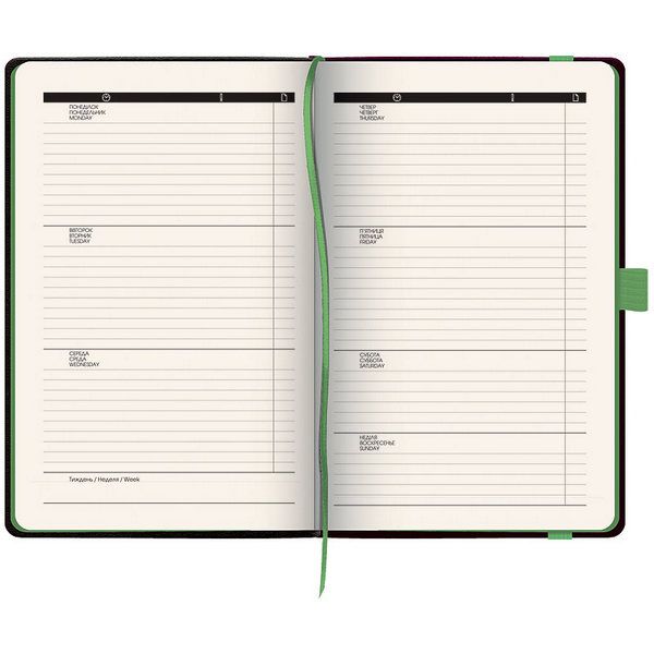 Мультифункциональная недатированная модель, в которой гармонично объединились еженедельник и блокнот. Отличное решение для тех, кому необходимо одновременно планировать и детализировать большое количество задач. Трендовый европейский формат еженедельника в черной обложке с салатовым срезом выглядит стильно. Сделан из плотной кремовой бумаги плотностью 80 г/м2 с деликатной серой печатью. Удобный внутренний блок, страницы для общего планирования на год, 2 закладки, петля для ручки, фиксирующая резинка, карман для бумажных мелочей на форзаце — каждая деталь тщательно выполнена и олицетворяет истинное немецкое качество. • Еженедельник: неделя на развороте. • Эластичная фиксирующая резинка. • Плотная кремовая бумага. • Деликатная печать серого цвета. • Страницы для общего планирования на год.