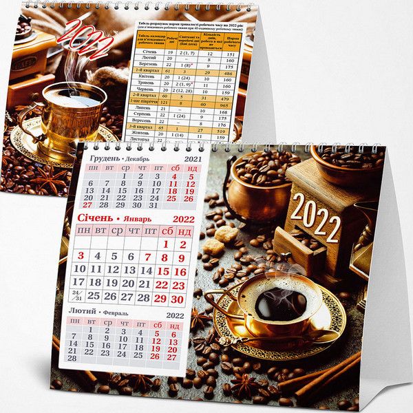 Календарь квартальный настольный "шалаш" с перекидным блоком на пружине с табелем расчета рабочего времени (пятидневная рабочая неделя) и календарём на полный год на обороте.