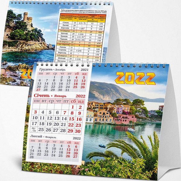 Календарь квартальный настольный "шалаш" с перекидным блоком на пружине с табелем расчета рабочего времени (пятидневная рабочая неделя) и календарём на полный год на обороте.
