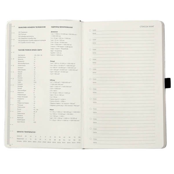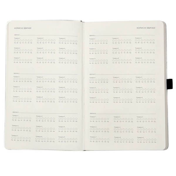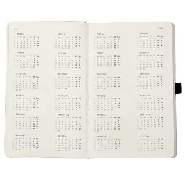 азмер: 125х195 мм. Кремовая бумага плотностью 80 г/м2. 192 страницы (в т. ч. 76 последних страниц – записная книга в клетку). Гибкая обложка Flex из термо-PU. Две разноцветные закладки позволяют быстро найти и открыть нужные страницы. Карман на форзаце для бумажных мелочей. Эластичная резинка предотвращает произвольное открывание. Петля для ручки. Внутренний блок еженедельника содержит 2 части: полудатированный блок (есть день недели, но нет дат) в формате «неделя на развороте» и недатированный блок в виде записной книги в клетку. Благодаря этому еженедельник совмещает сразу 2 функции: можно планировать задачи по дням недели и параллельно делать подробные записи в свободной форме. Информационный блок содержит: • Календарь на 2020-2021-2022-2023 гг. • Трекер привычек. • Важные номера телефонов. • Часовые пояса. • Шкала температур. • Единицы измерения. • Место для записи прочитанных книг. Три языка: украинский, английский, русский.