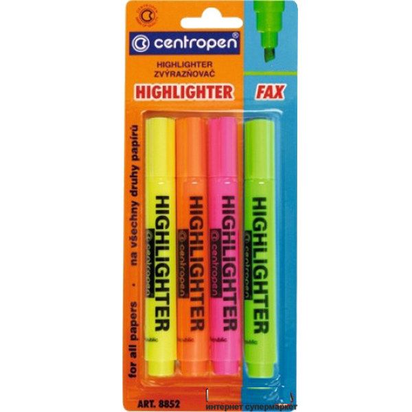 Centropen Fax — маркер для плавного и легкого выделения текста на всех видах бумаги Особенности: Маркер с повышенным объемом чернил и со специальным супергибким наконечником Не высыхает без колпачка в течение 5 дней Светостойкие чернила на водной основе, насыщенные цвета След не передаётся по факсу, не просачивается сквозь бумагу Не размазывает текст, распечатанный на струйном принтере Клиновидный пишущий узел Пишущий узел выдерживает большую нагрузку без деформации Ширина следа: 1-4.6 мм