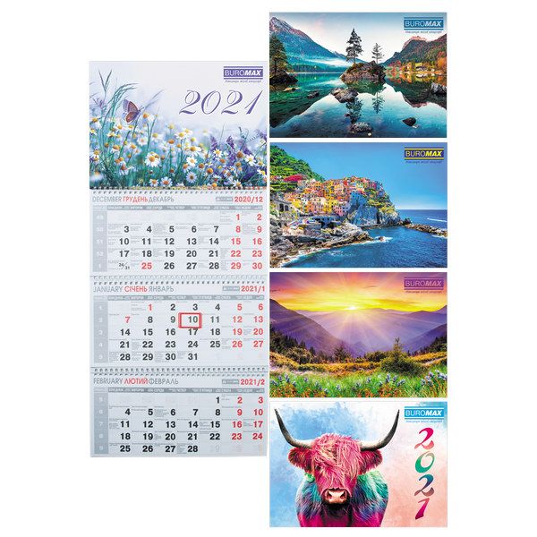 Календарь BUROMAX - незаменимая вещь, которая поможет Вам легко спланировать свой месяц, квартал и год. Удобный настенный квартальный календарь на 3-х пружинах На розвороте три месяца Размер изделия: 297х630мм Размер постера: 298х210мм, изготовленный из картона 300г / м² Размер блоков: 298х140мм, изготовленные из мелованной бумаги 90г / м² Календарная сетка на трех языках: украинском, русском, английском Комплектуется указателем даты и отверстием для крепления Дополнительная информация: церковные, государственные и профессиональные праздники, выходные дни В упаковке 4 дизайна (по 5 шт. каждого)