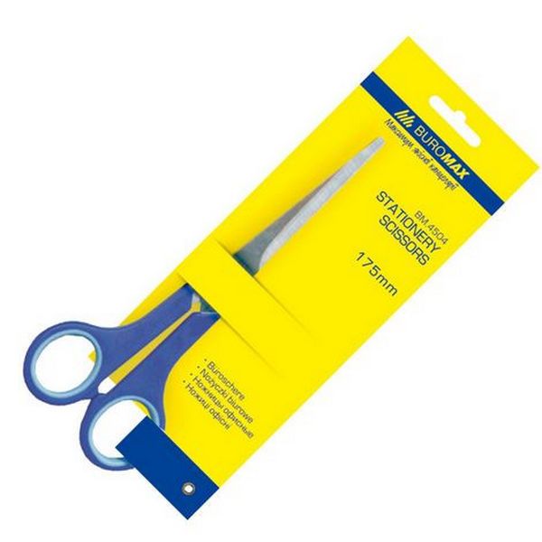 Офисные ножницы Buromax. Подходят для резки бумаги, картона, фотобумаги, ткани и т.д. У ножниц плавный и мягкий ход резки. Закругленные лезвия изготовлены из нержавеющей стали, и гарантируют безопасность во время резки. Цельнометаллический корпус с резиновыми вставками на ручках. Эргономичная форма ручек и прорезиненные вставки обеспечивают комфорт во время работы. Индивидуальная блистерная упаковка открытого типа. Длина ножниц: 175 мм.