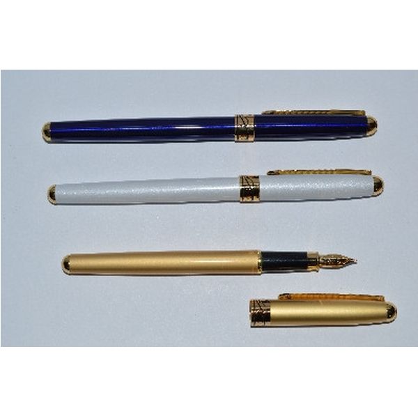 Ручка перьевая в металлическом корпусе с возможностью замены картриджа. Цвета корпуса в ассортименте: синий, белый, золотой.
