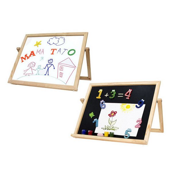 Характеристики настольного, двустороннего мольберта (мел + маркер), ROSA Studio • Две рабочие поверхности – для рисования мелом и маркером – магнитные; • На мольберте можно работать водными маркерами, мелом; • Можно прикрепить лист бумаги к доске и рисовать красками или карандашами; • Поворотная подставка, легко прячется в плоскость мольберта; • Мольберт можно использовать на столе, полу и т.д.; • Рабочая поверхность вращается для того, чтобы воспользоваться той или иной стороной; • Компактно складывается для транспортировки и хранения; • При разложении ножки мольберта фиксируются крепким цепочкой, который обеспечивает устойчивость во время работы; • Планка-перекладина для аксессуаров, которая будет обеспечивать возможность хранения мела и др. принадлежности и задерживать осыпания мелового пыли. Размер: 49х30,5х30,5 см Рабочая поверхность: 30х40см Материал изготовления: Сосна