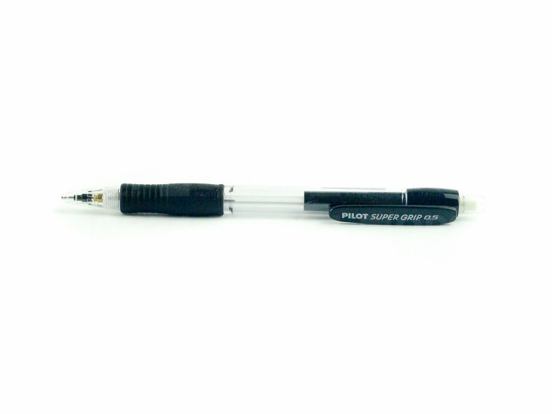 Карандаш механический «Super Grip». Прозрачный пластиковый корпус с резиновым упором для пальцев и убирающейся металлической цангой. Стержень 0,5 мм. Цвет корпуса – черный.