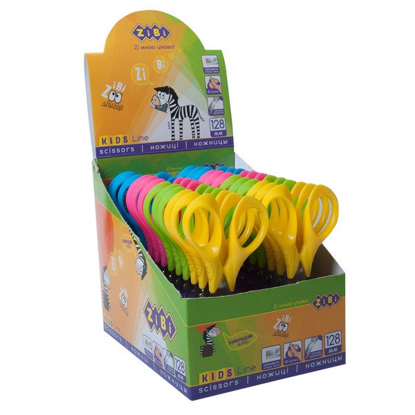 Длина ножниц 128 мм. Пластиковые 3D ручки. Лезвия из нержавеющей стали. Закругленные кончики лезвий. В картонном дисплее по 24 штуки.