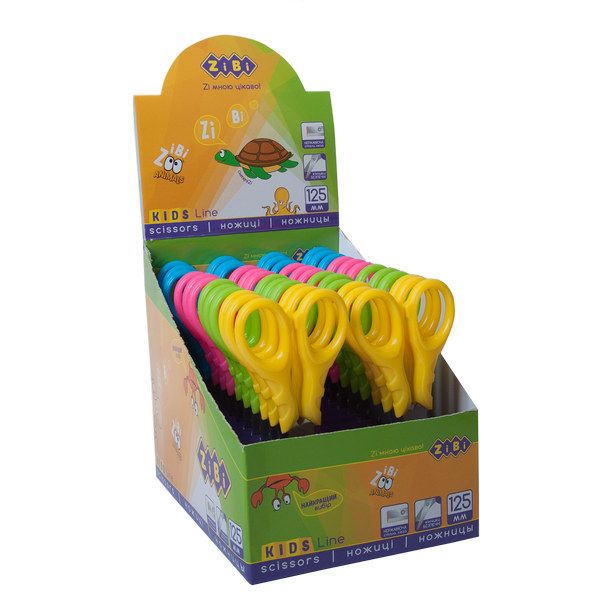 Длина ножниц 125 мм. Фигурные пластиковые ручки. Лезвия из нержавеющей стали. Закругленные кончики лезвий. В картонном дисплее по 24 штуки.