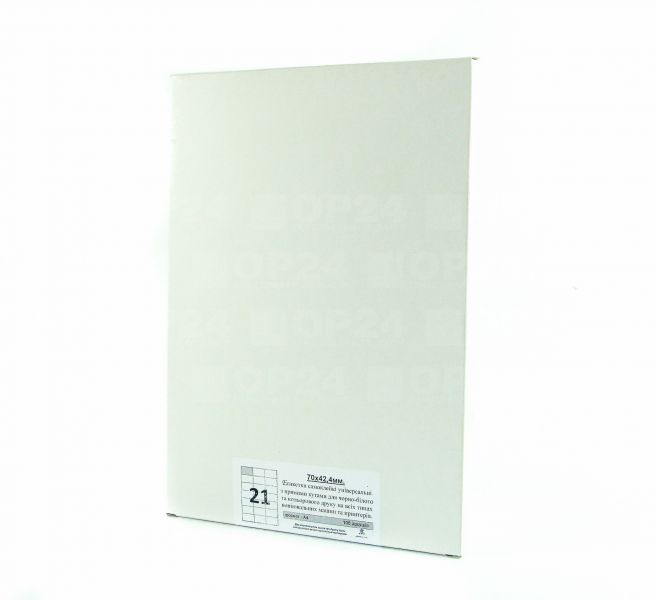 Самоклеящиеся этикетки размером 70*42,4мм - 21 штука на лист предназначены для лазерных и струйных принтеров, а также копировальных аппаратов. Применяются для адресации писем и посылок, штрих кодирования товаров, классификации документов. Высококачественная бумага, силиконовая подложка: печать хорошо держится, не даёт запахов в принтере, этикетки аккуратно отклеиваются от основы. Формат А4, 100 листов. Упаковка – пленка. Цвет белый..